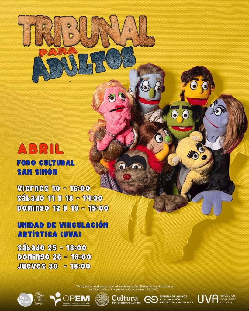 La invitación para ver Tribunal para adultos es este sábado 18 a las 14:40 h y domingo 19 de abril a las 15:00 h en el Foro Cultural San Simón, así como el sábado 25, domingo 26 y jueves 30 de abril a las 18:00 h en la Unidad de Vinculación Artística (UVA). Todas las funciones son de entrada gratuita, por lo que se recomienda llegar con antelación. Para más información pueden consultar las redes sociales de la compañía en Facebook como OPEM A.C.